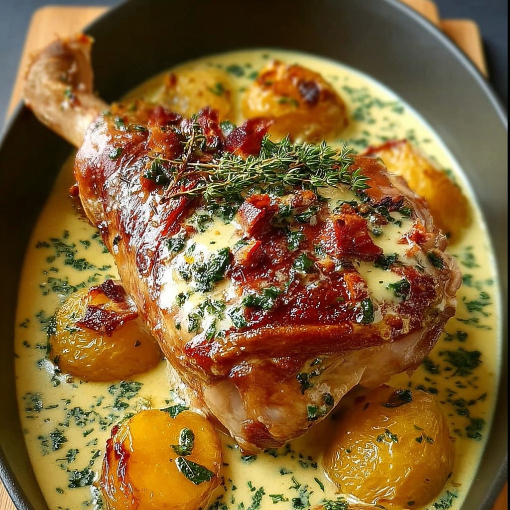 La cuisson lente à feu doux garantit que la viande reste tendre et juteuse, que la sauce s’épaississe et que les arômes se concentrent. Une cuisson trop rapide ou trop forte risquerait de dessécher la cuisse et de briser l’équilibre de la sauce.