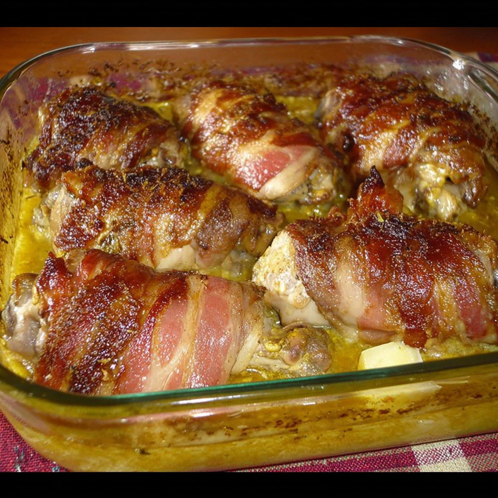 imaginez une soirée d’automne : les oignons fondants qui s’attendrissent doucement dans l’huile d’olive dans votre poêle s’épanouissent en arôme. le lit chaud d’oignons moelleux accueille les cuisses badigeonnées de moutarde. les tranches de poitrine fumée enveloppent le poulet et promettent un contraste de textures à la sortie du four. une fois la crème versée, le jus s’unifie pour devenir une sauce douce et réconfortante. dès que les trente premières minutes de cuisson sont passées, la cuisine embaume un parfum salin et crémeux, tandis que le four dore délicatement le sommet des cuisses.