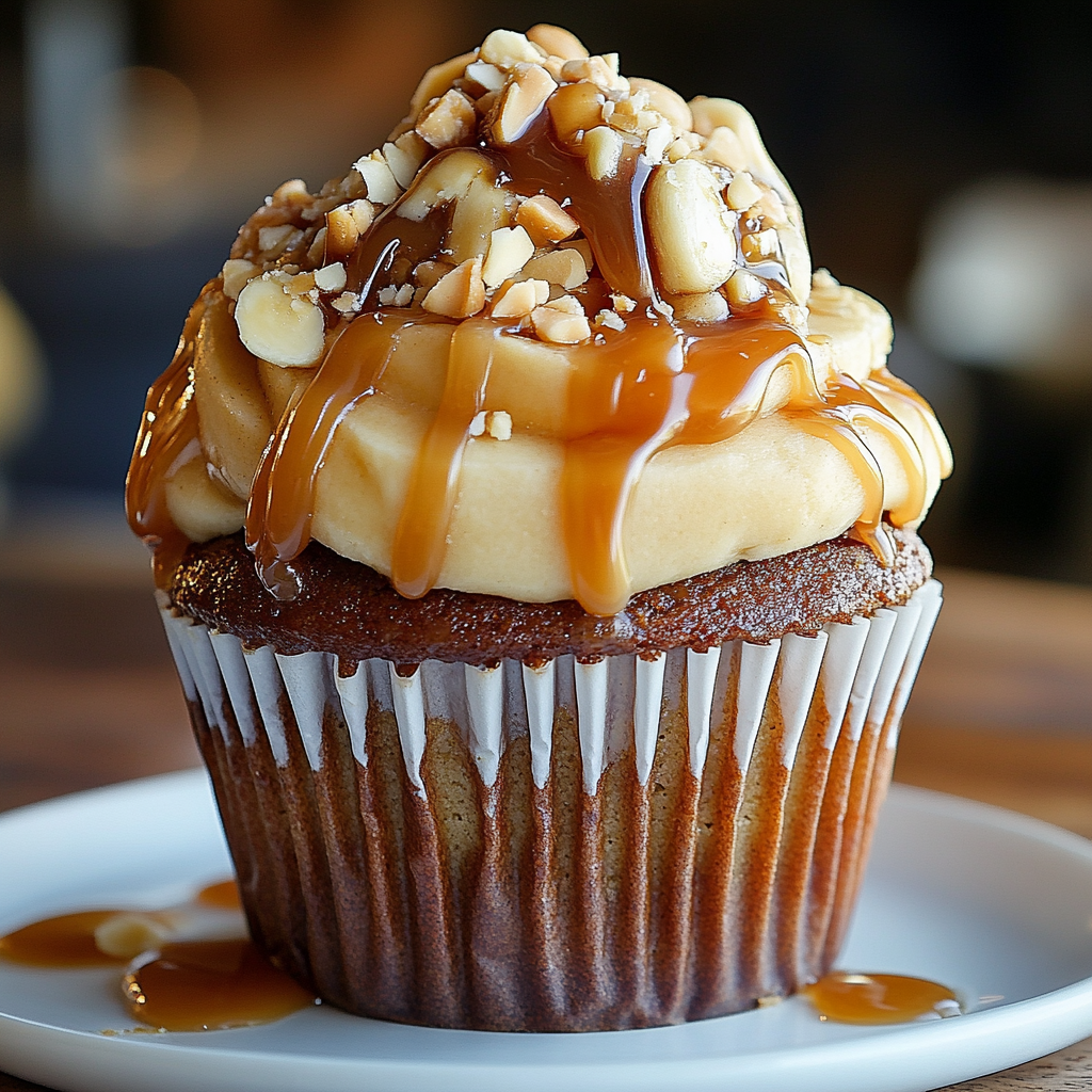 Des cupcakes moelleux à la banane, garnis de beurre de cacahuète, de caramel et de cacahuètes!