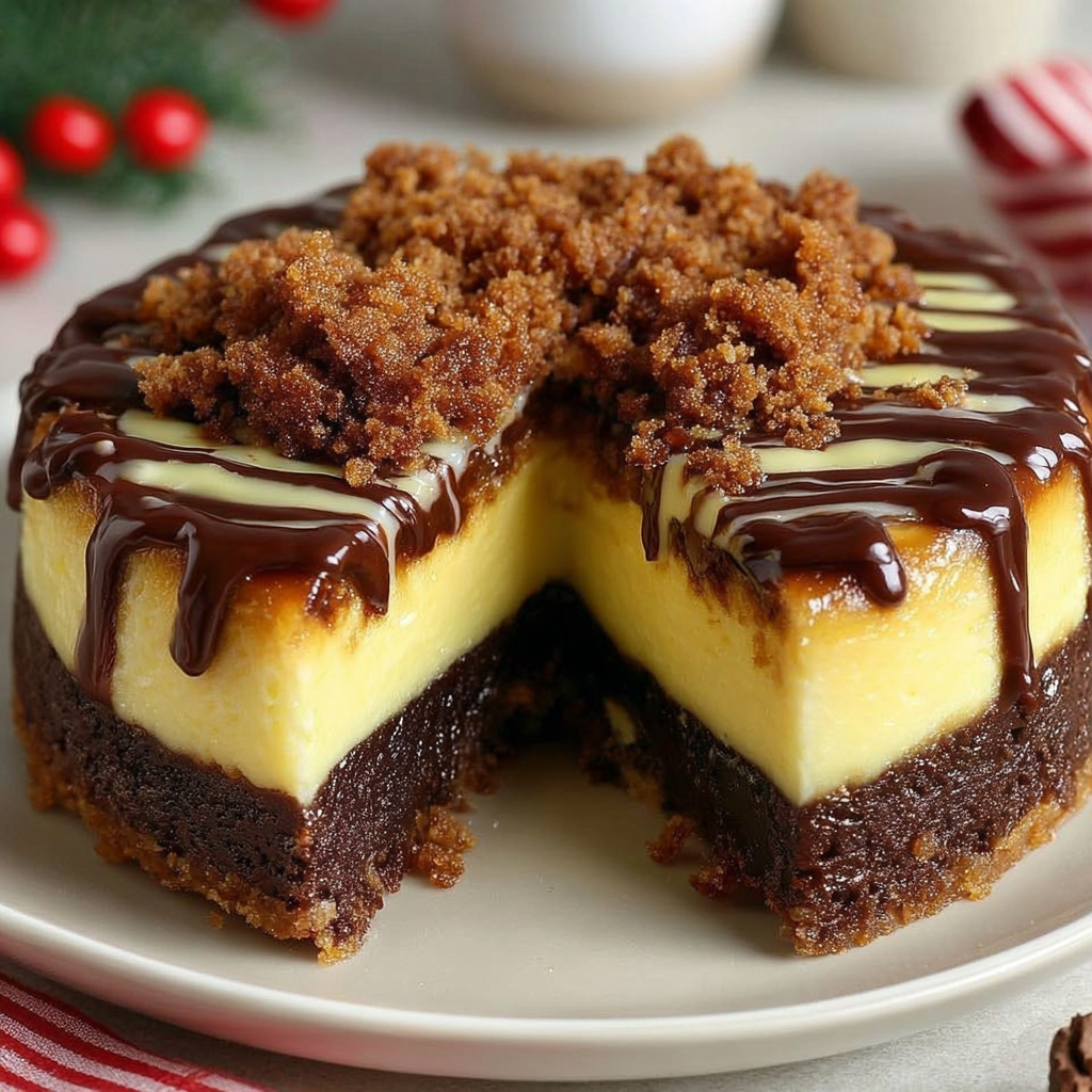 Chaque bouchée révèle une base biscuitée chocolatée, une couche de cheesecake onctueux au beurre, un cœur chocolat fondant, et un dessus croustillant façon crumble. Ce dessert est parfait pour les anniversaires, les goûters de fête, ou simplement pour se faire plaisir avec une pâtisserie maison digne d’une vitrine de salon de thé.