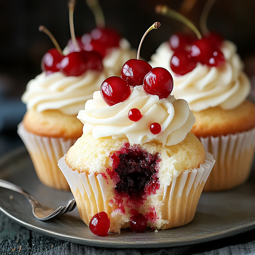 Une fois les cupcakes refroidis, creusez un trou au centre de chaque cupcake et remplissez-le de confiture de cerises.
