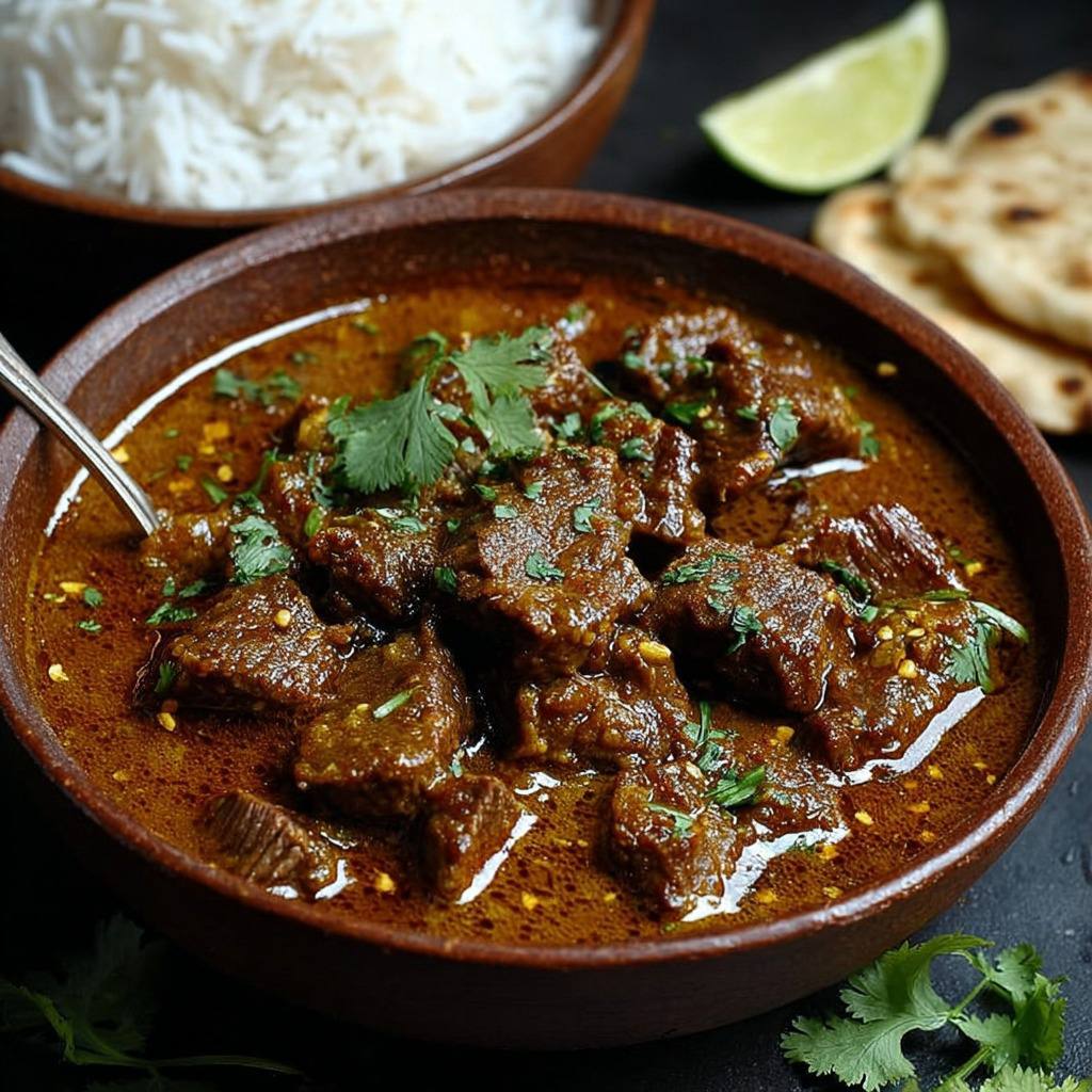 Les tomates sont ensuite incorporées, apportant une légère acidité qui équilibre la puissance des épices. On laisse mijoter jusqu’à ce que l’huile se sépare de la sauce, signe que les ingrédients se sont harmonieusement mélangés. Le yaourt est ajouté hors du feu pour éviter qu’il ne caille, puis mélangé soigneusement. On verse alors le bouillon chaud, on ajoute les clous de girofle, la cannelle, la cardamome et le laurier, puis on couvre la cocotte pour laisser mijoter à feu doux pendant environ une heure et demie à deux heures.