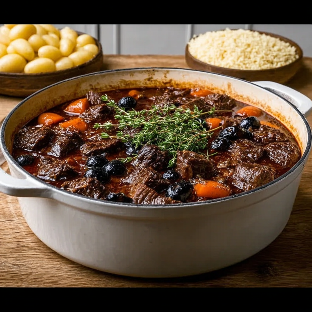 La daube de bœuf à la provençale est un grand classique de la cuisine traditionnelle française. Originaire du sud de la France, ce plat mijoté longuement est apprécié pour sa viande tendre, sa sauce riche et ses arômes méditerranéens. C’est une recette généreuse, parfaite pour les repas en famille ou les grandes tablées conviviales.