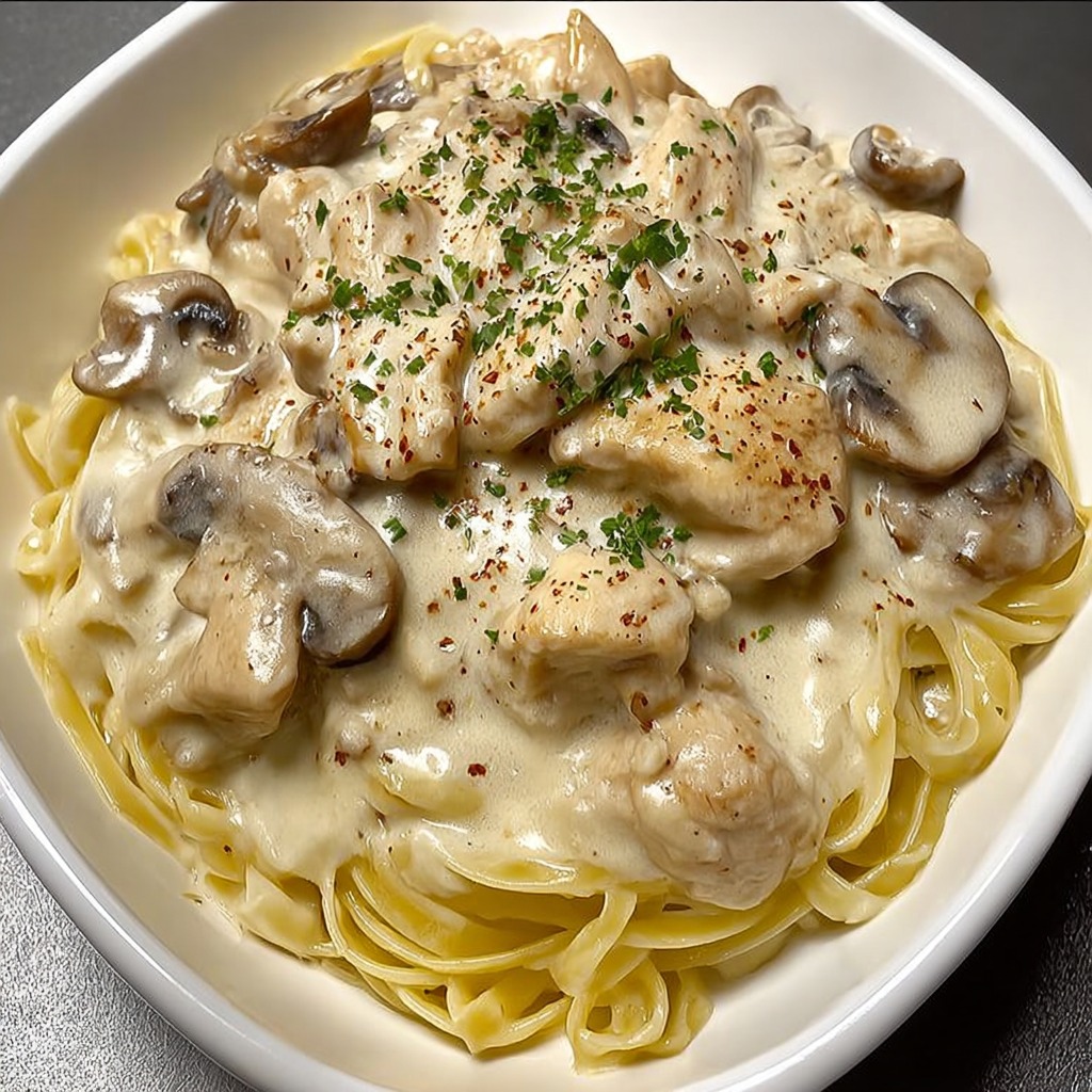 Délice de spaghetti crémeux au poulet et aux champignons