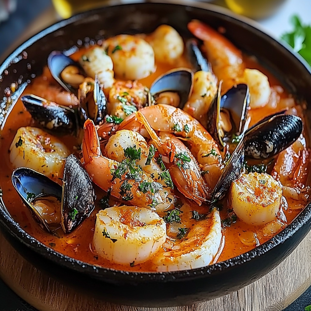 Ce plat vibrant aux saveurs méditerranéennes regorge de fruits de mer tendres et épicés, parfait pour réchauffer les papilles avec une explosion de goûts !