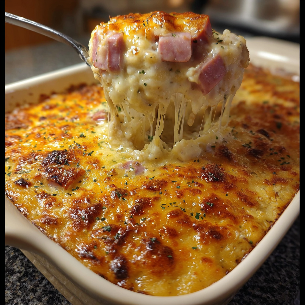 Il se rapproche d’un gratin dauphinois revisité, enrichi de jambon et parfois de légumes selon ce qu’on a sous la main. On obtient une cocotte fondante à l’intérieur, avec une belle croûte dorée sur le dessus.