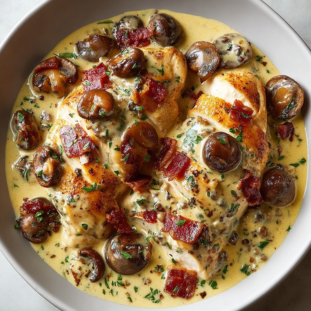 Émincés de poulet à la sauce crémeuse à la moutarde, lardons fumés et champignons