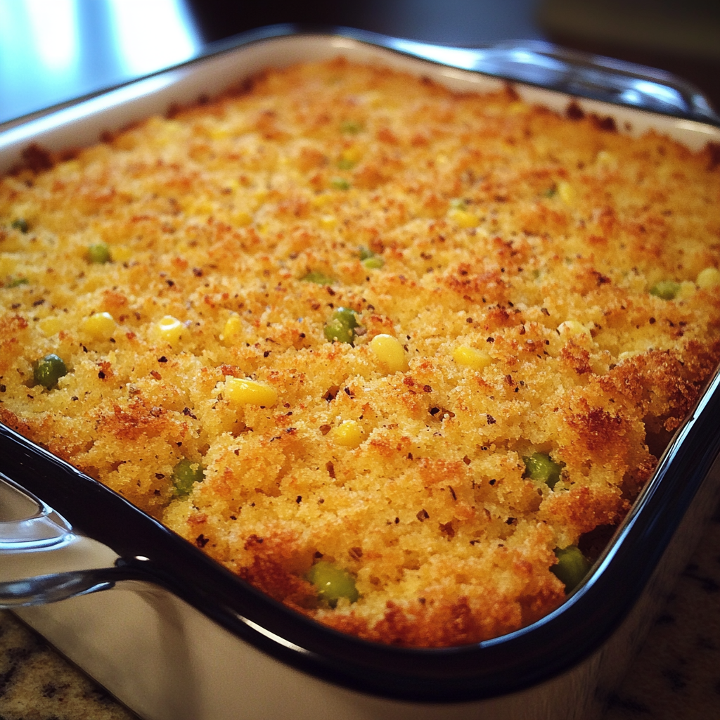 Le Dressing de Maïs de Mama est une recette classique qui combine des ingrédients simples pour créer un plat réconfortant parfait pour les fêtes ou les repas familiaux. Ce plat est préparé avec des oignons, du céleri, du pain grillé émietté et du maïs, auxquels s’ajoutent des œufs et un bouillon de dinde pour lier le tout. Le beurre ajoute une texture riche, tandis que la sauge et l’assaisonnement pour volaille apportent une profondeur de saveur.