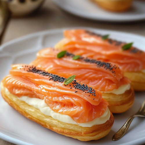 - Décoration élégante : Garnissez le dessus des éclairs avec une fine tranche de saumon roulée en rose ou un brin d’aneth frais.