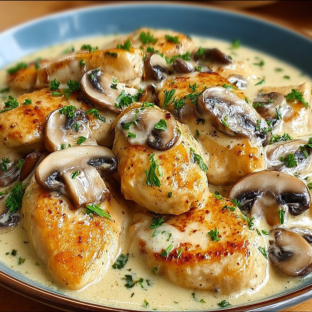 Verser la crème liquide dans la poêle et mélanger délicatement pour obtenir une sauce homogène. La crème va apporter douceur, rondeur et onctuosité, équilibrant parfaitement les saveurs des champignons et du poulet. À cette étape, on peut ajouter une cuillère de moutarde douce pour renforcer subtilement le caractère de la sauce. Laisser la préparation chauffer quelques minutes jusqu’à ce qu’elle atteigne une texture nappante.