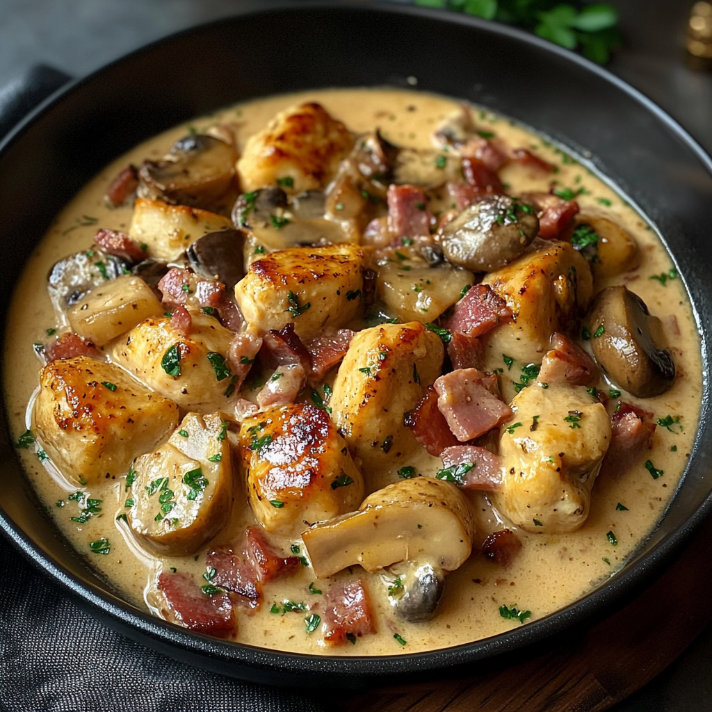 Un plat riche en saveurs, combinant la tendreté du poulet, le goût fumé des lardons et la douceur des champignons, relevé par une sauce à la moutarde crémeuse. Idéal pour un dîner rapide mais gourmand.