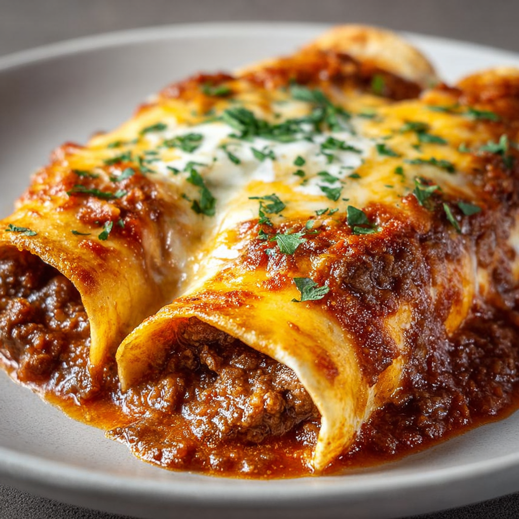 Un plat familial réconfortant qui combine des tortillas moelleuses, une garniture généreuse à base de bœuf haché épicé, de sauce tomate pimentée et de fromage fondant gratiné au four.
