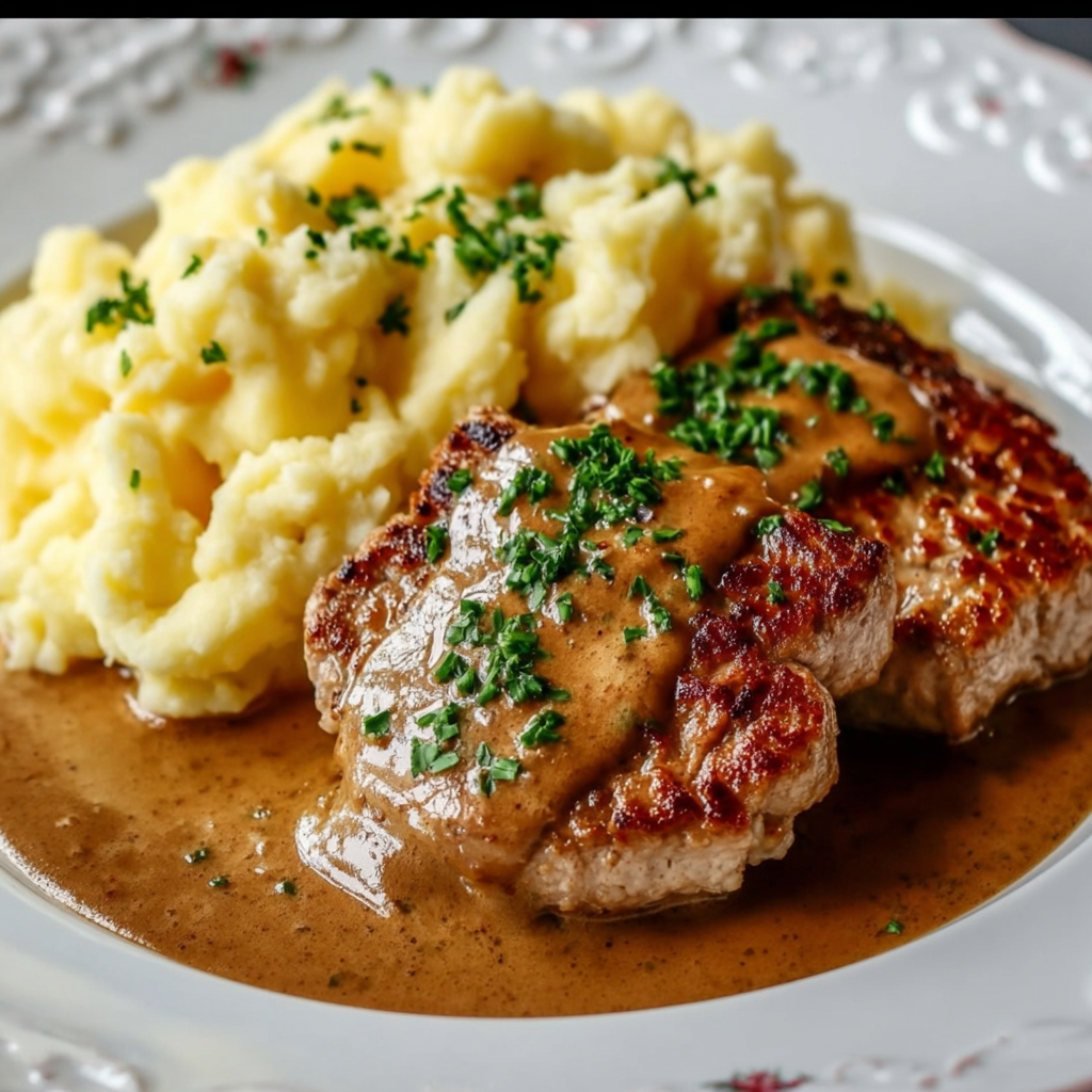 Servez les Rahmschnitzel immédiatement, nappés de sauce et décorés de persil frais.