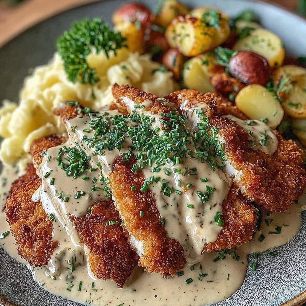 L’escalope panée accompagnée d’une sauce crémeuse, de purée de pommes de terre et de pommes de terre rôties est un plat complet, généreux et réconfortant, alliant tendreté de la viande, douceur de la purée et croustillant des pommes de terre rôties. Cette recette classique de la cuisine française familiale séduit par son équilibre de textures et de saveurs, transformant un repas simple en un véritable festin gourmand, idéal pour un déjeuner ou un dîner convivial.