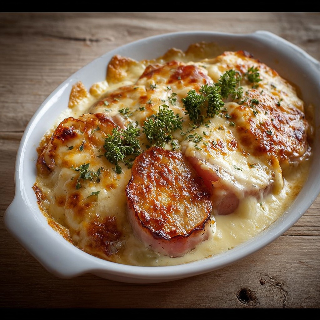 Visuellement, l’escalope savoyarde gratinée est très appétissante. La surface dorée du reblochon fondu attire immédiatement l’œil. En découpant une part, on découvre des couches contrastées : la volaille tendre, la sauce crémeuse nappant les oignons, et les pommes de terre légèrement fondantes. Le fromage forme des fils fondants et une couche supérieure légèrement croustillante aux bords caramélisés.