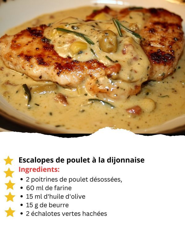 cette recette propose des escalopes de poulet généreusement nappées d’une sauce crémeuse à la moutarde et à l’estragon. simple, rapide et savoureuse, elle convient parfaitement à un repas de semaine ou un dîner plus élégant. le texte suit vos consignes : un style fluide et uniforme, sans mise en forme particulière, sans liens, sans emojis, sans symboles spéciaux, avec des quantités précises et des explications claires.