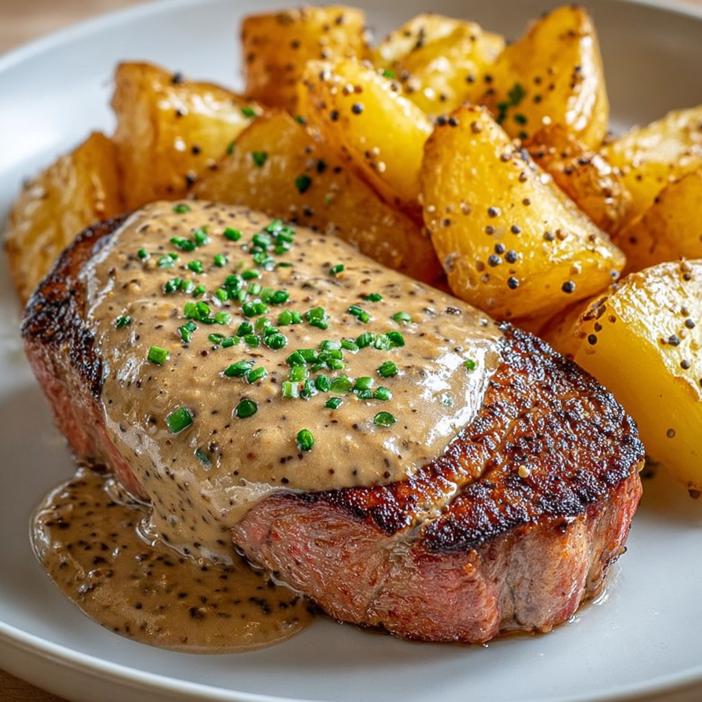 Faux-Filet Sauce au Poivre & Pommes de Terre Rôties