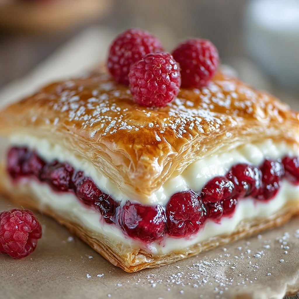 En conclusion, le feuilleté à la crème pâtissière et aux framboises n’est pas seulement une recette, mais une véritable œuvre culinaire. Il marie l’art du feuilletage, l’onctuosité d’une crème classique et la vivacité des fruits rouges. Accessible à préparer à la maison, mais digne des vitrines de pâtisseries, il demeure un dessert intemporel et séduisant. Chaque détail, de la cuisson de la pâte à l’agencement des framboises, contribue à en faire une expérience gustative mémorable.