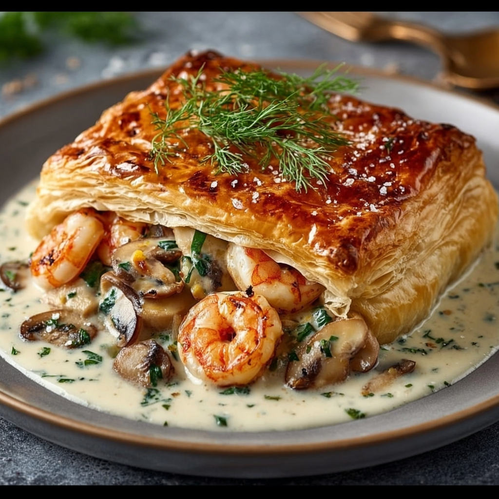 Un feuilleté chic et délicatement parfumé, où le croustillant doré de la pâte révèle un cœur fondant et crémeux aux saveurs marines et boisées. Ce plat élégant, simple à réaliser et toujours impressionnant, est parfait pour un dîner raffiné, une entrée festive ou même un repas du week-end en famille.