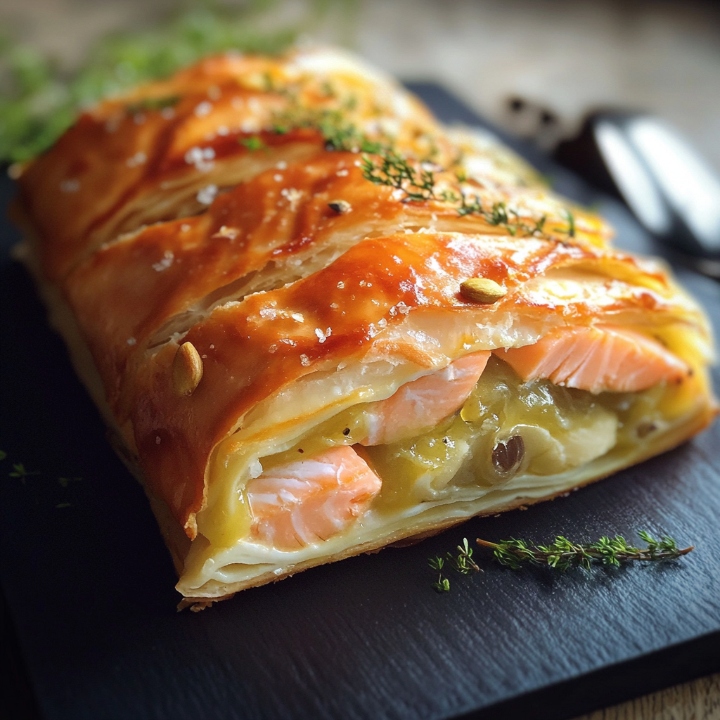 Savourez cette recette élégante de feuilleté alliant saumon et poireaux pour un apéritif savoureux qui ravira vos invités. Ce plat combine des saveurs délicates et une texture croustillante, parfait pour toute occasion.
