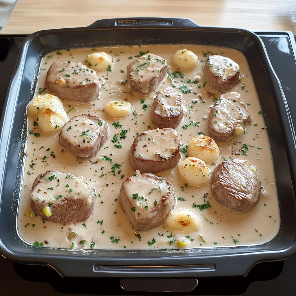 Filet mignon tendre mijoté dans une sauce crémeuse pour un repas raffiné et réconfortant.