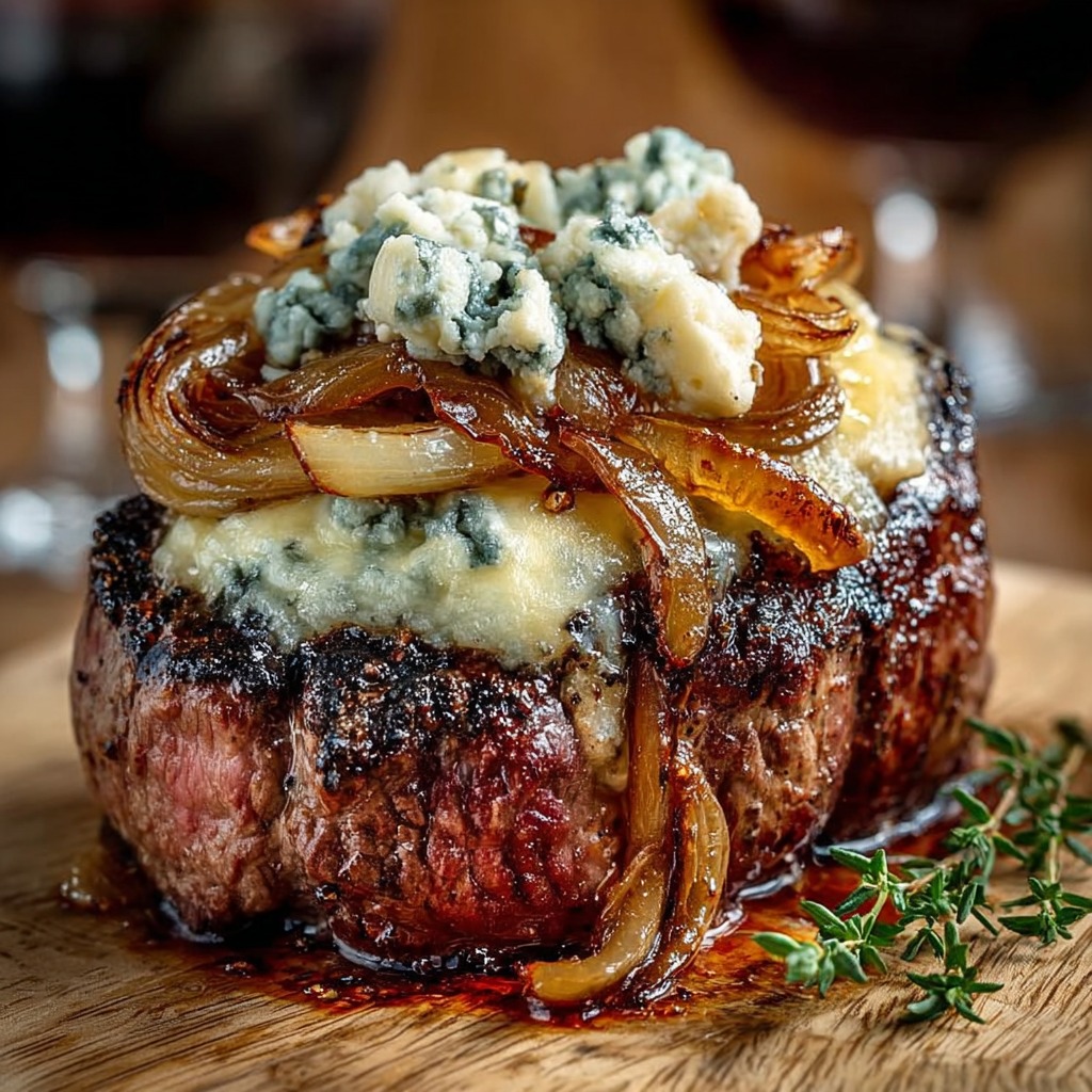 Filet mignon au fromage bleu et oignons caramélisés