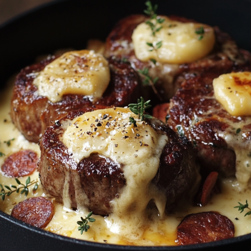 La recette de Filet Mignon au Fromage pour Tartiflette et Chorizo est un plat riche, savoureux et réconfortant, idéal pour les froides soirées d’hiver ou un dîner chaleureux entre amis. Ce mélange entre la tendreté du filet mignon, le fromage crémeux et le piquant du chorizo en fait un repas complet qui plait à tous.