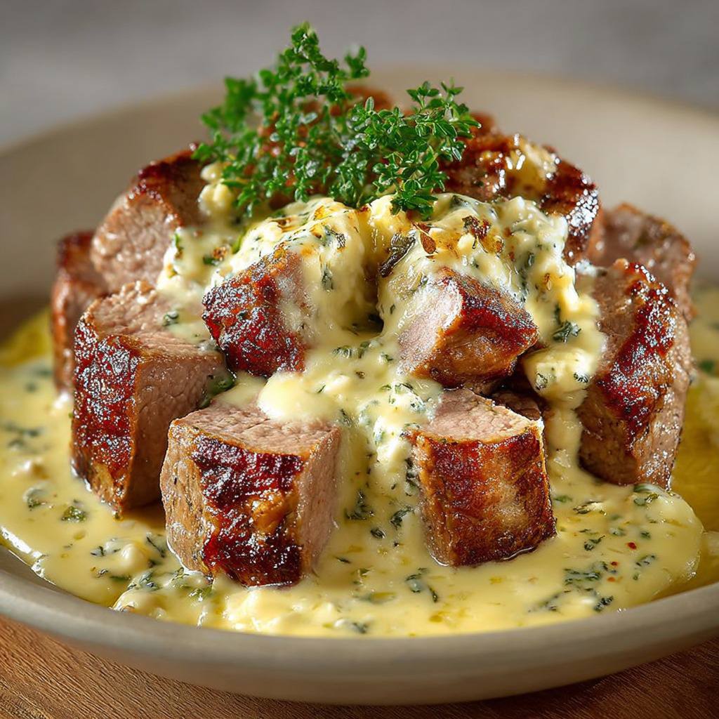 On tranche le filet mignon en médaillons et on dispose les morceaux dans les assiettes. La sauce au reblochon est versée généreusement par-dessus, enveloppant chaque tranche de viande. On peut parsemer d’un peu de thym frais pour apporter une touche de couleur et de fraîcheur. Le plat se marie très bien avec des pommes de terre rôties, une purée maison, des légumes grillés ou une simple salade verte pour un contraste de texture et de fraîcheur.