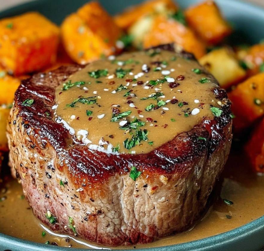 Le filet mignon de bœuf avec sauce au poivre et légumes rôtis constitue un plat raffiné et complet, adapté à un repas familial ou à une occasion spéciale. La combinaison de la viande tendre, de la sauce crémeuse et des légumes rôtis offre un équilibre parfait entre goût, texture et esthétique.