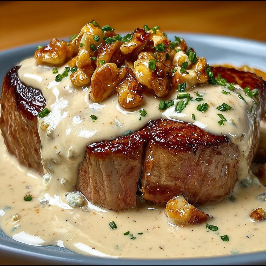 Pour le dressage, les médaillons sont déposés dans les assiettes puis nappés généreusement de sauce roquefort blanche. Les noix concassées sont réparties au-dessus pour ajouter une touche de croquant qui équilibre la texture fondante du plat. Ce mariage entre la viande tendre, la sauce crémeuse et la note croquante des noix crée une harmonie gustative particulièrement appréciée.