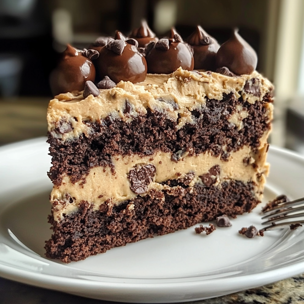 - Assemble Cake: Place one brownie cake layer on a serving plate or cake stand. Spread a generous layer of the cookie dough buttercream on top. Place the second cake layer on top and press down gently. Frost the top and sides of the cake with the remaining buttercream, smoothing it out with a spatula. Decorate the cake with mini chocolate chips and extra cookie dough chunks if desired.