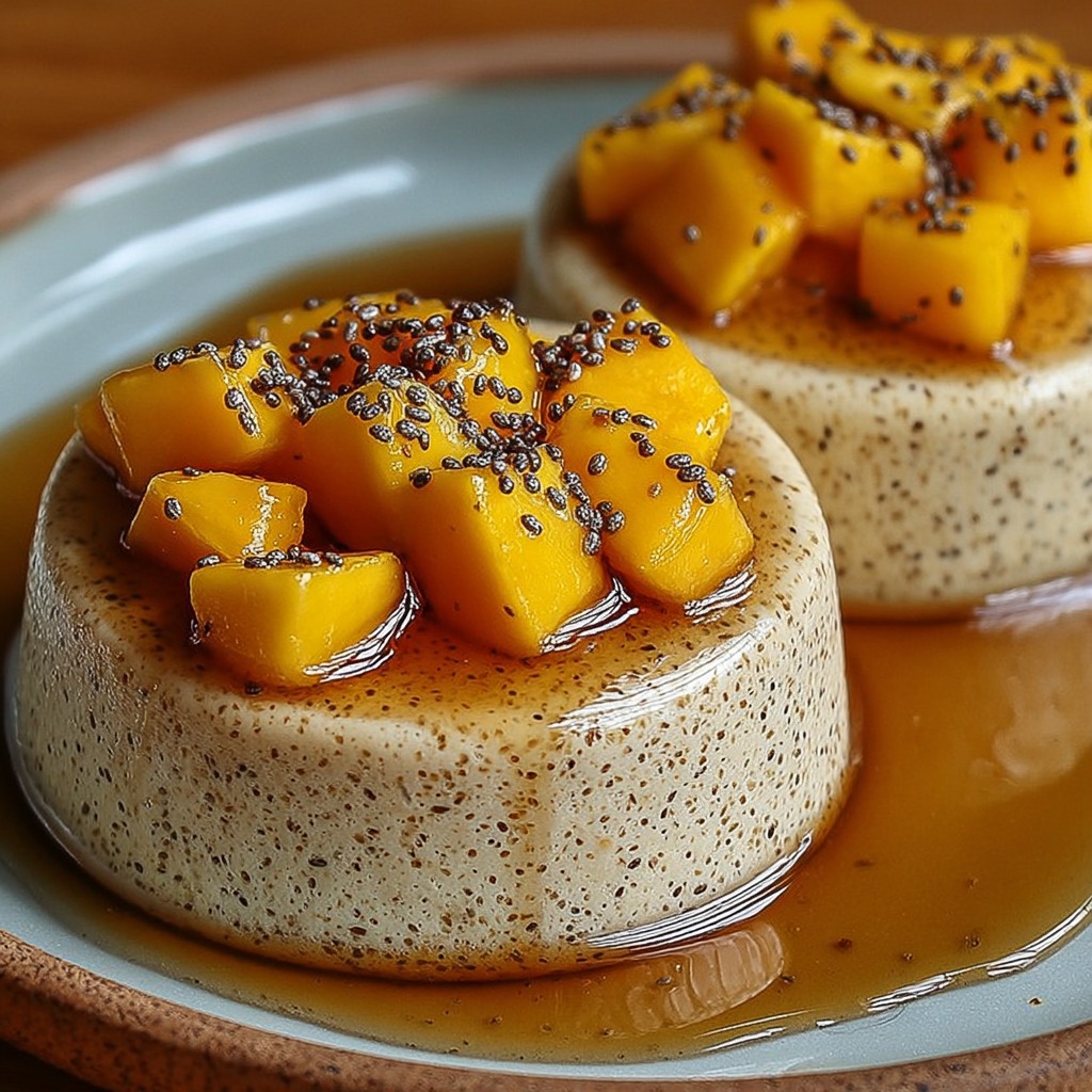Les graines de chia apportent un croquant subtil et une texture supplémentaire, tout en enrichissant le dessert en fibres et en oméga-3. Elles peuvent être saupoudrées sur le dessus juste avant le service pour conserver leur croquant. Elles créent un contraste avec le fondant du tapioca et la douceur de la mangue rôtie. Leur présence, bien que discrète, participe à l’harmonie visuelle et gustative de la galette.