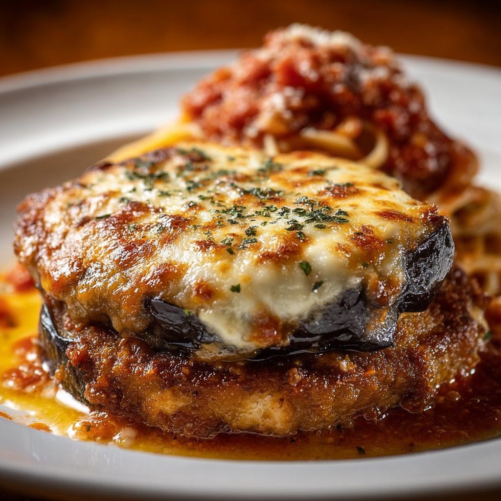 Les galettes de porc associées aux aubergines fondantes et au fromage gratiné offrent un mélange parfait de textures et de saveurs. La douceur des aubergines contraste avec la richesse du porc et la crémeuse mozzarella, tandis que la sauce tomate apporte acidité et fraîcheur. Les linguines à l’ail complètent le plat avec un parfum délicat et une texture légère, équilibrant l’ensemble.