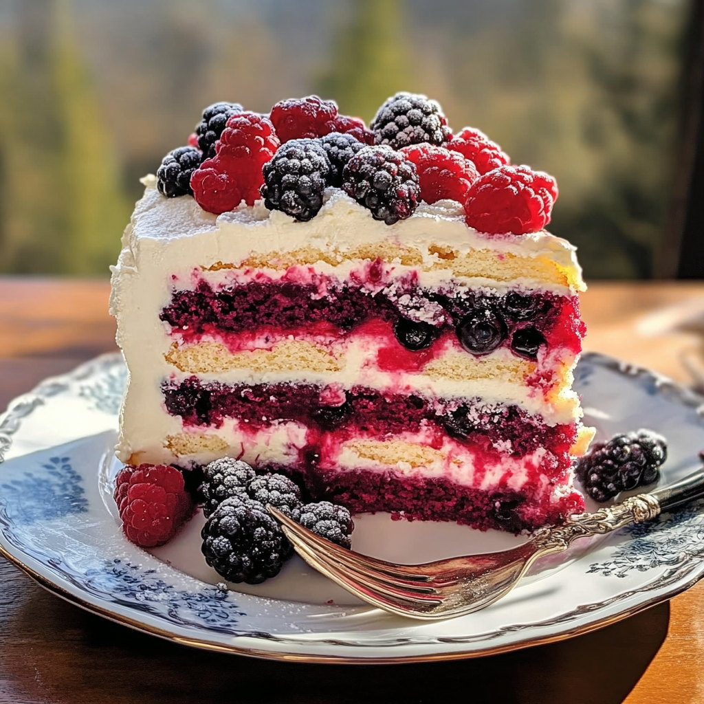 Un gâteau moelleux aux baies mélangées, surmonté d’une crème fouettée légère et décoré de baies fraîches. Parfait pour les amateurs de desserts fruités et gourmands !
