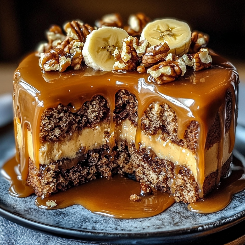 Un gâteau délicieux alliant banane, noix croquantes et un nappage caramel irrésistible ! Ce dessert allie la douceur des bananes à la richesse du caramel, pour un goût que vous allez adorer.