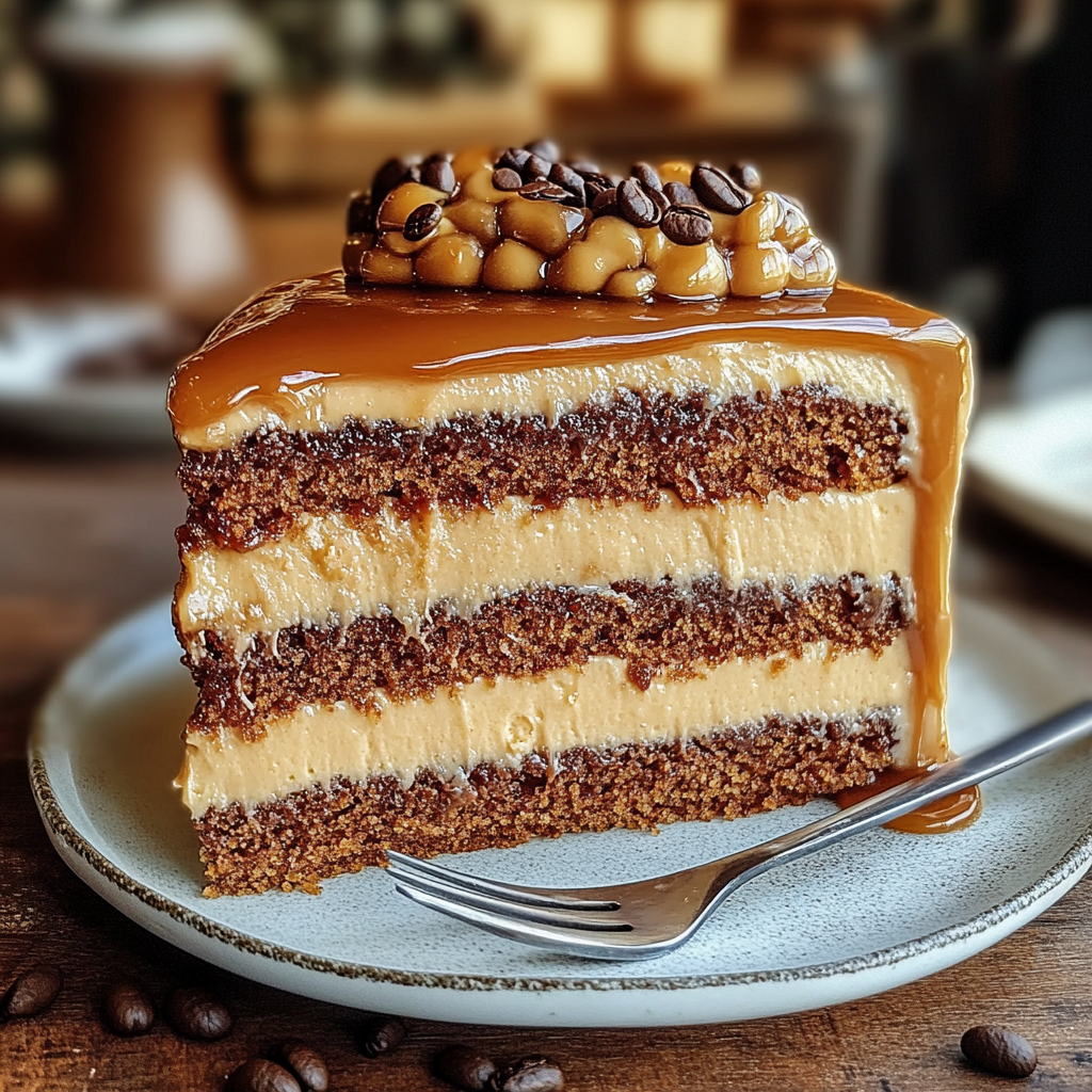 Coupez le gâteau en parts et savourez la délicieuse texture de ce gâteau caramel café ! Chaque bouchée est un véritable régal pour les amateurs de sucré.