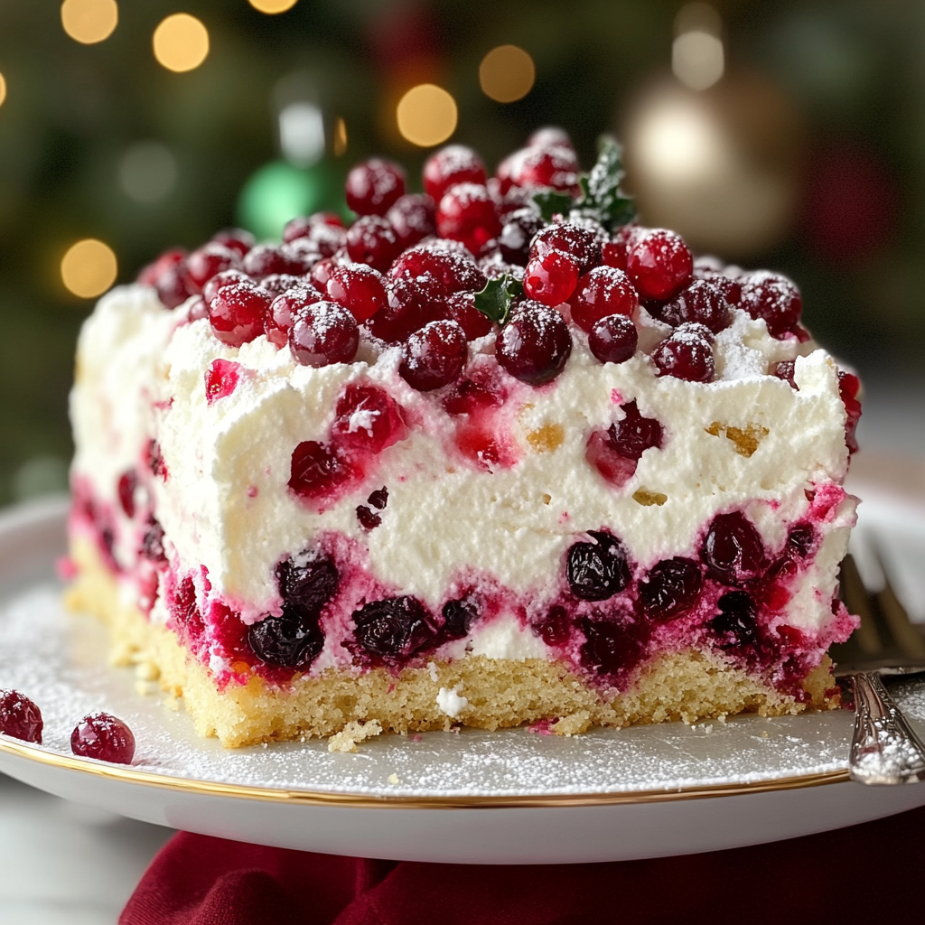- Coupez et servez : Coupez le Gâteau Poke aux Canneberges de Noël en carrés et servez frais. Profitez de la délicieuse saveur de canneberge et du gâteau moelleux !