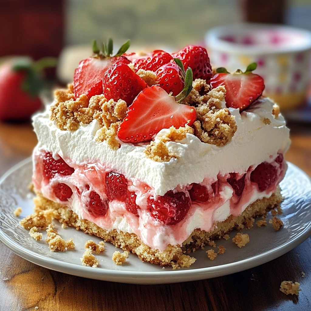 Un gâteau moelleux avec une touche de fraise, crème fouettée et croustillant au chocolat !