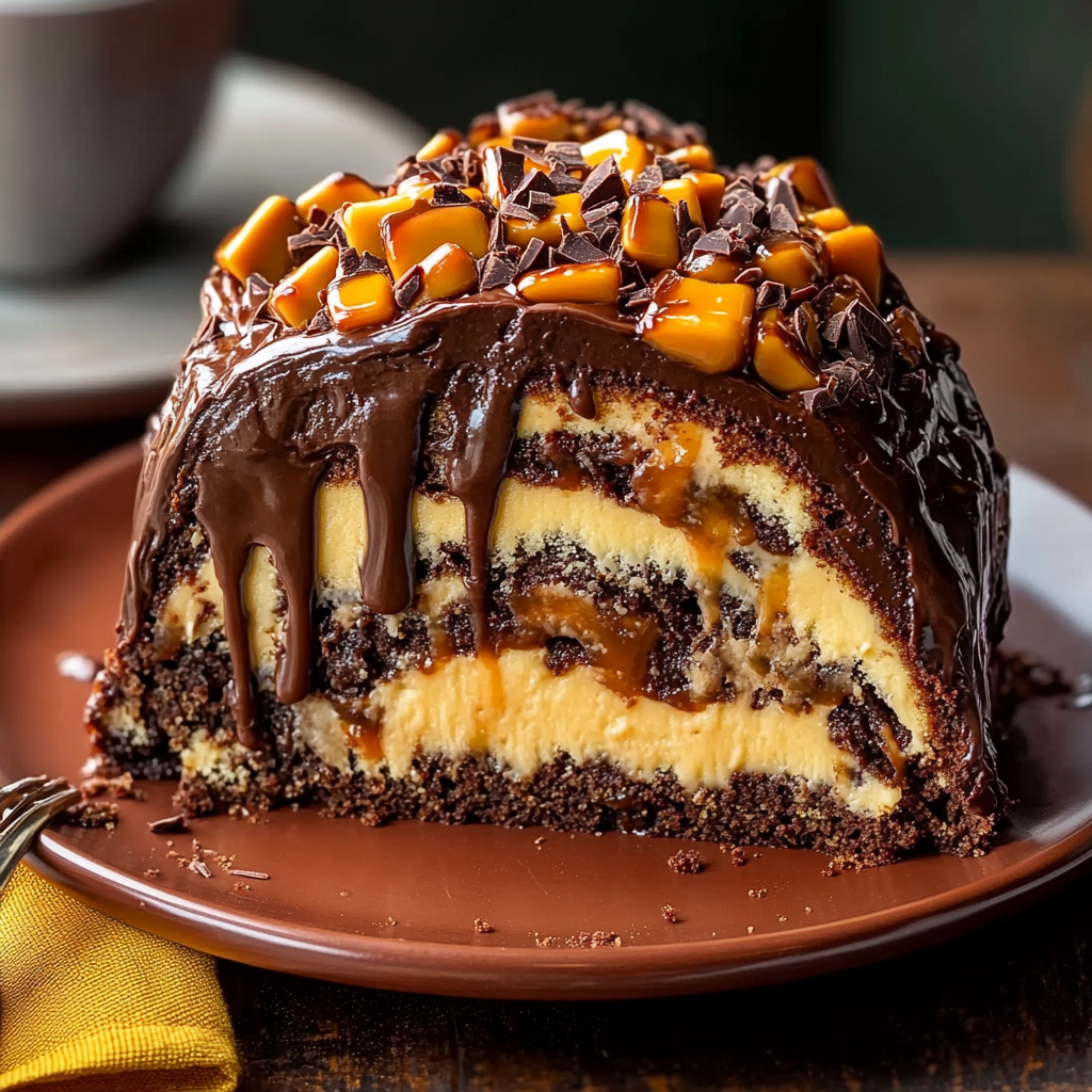 Un dessert décadent avec des couches de chocolat, caramel et des noix croquantes dans un roulé moelleux !