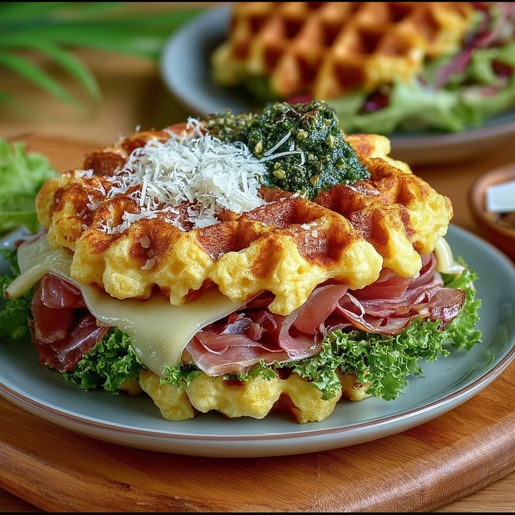 Les gaufres salées sont une alternative originale et savoureuse aux classiques sandwiches ou tartines. Elles sont parfaites pour un buffet, un brunch ou un apéritif dînatoire, car elles se préparent facilement, peuvent être servies tièdes ou froides et plaisent à tous les âges. Cette version, garnie de jambon, de fromage fondant et de salade fraîche, offre un équilibre parfait entre croustillant, onctuosité et fraîcheur.