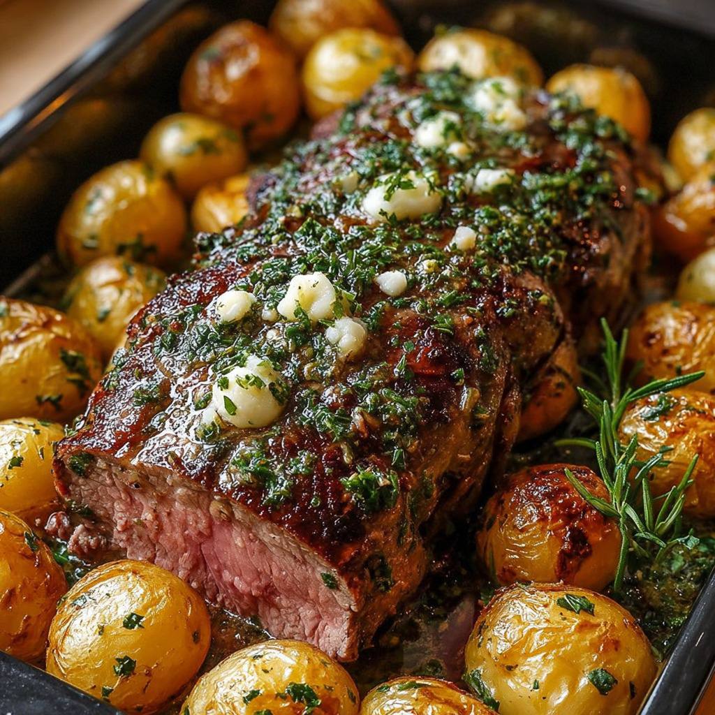 gigot d’agneau à l’ail et aux herbes avec pommes de terre grenaille