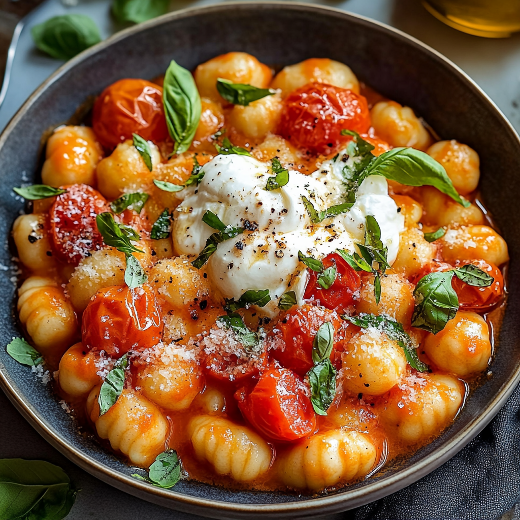 Un plat italien réconfortant, avec des gnocchis moelleux, une sauce tomate crémeuse et une burrata fondante. Parfait pour un dîner convivial en famille ou entre amis.