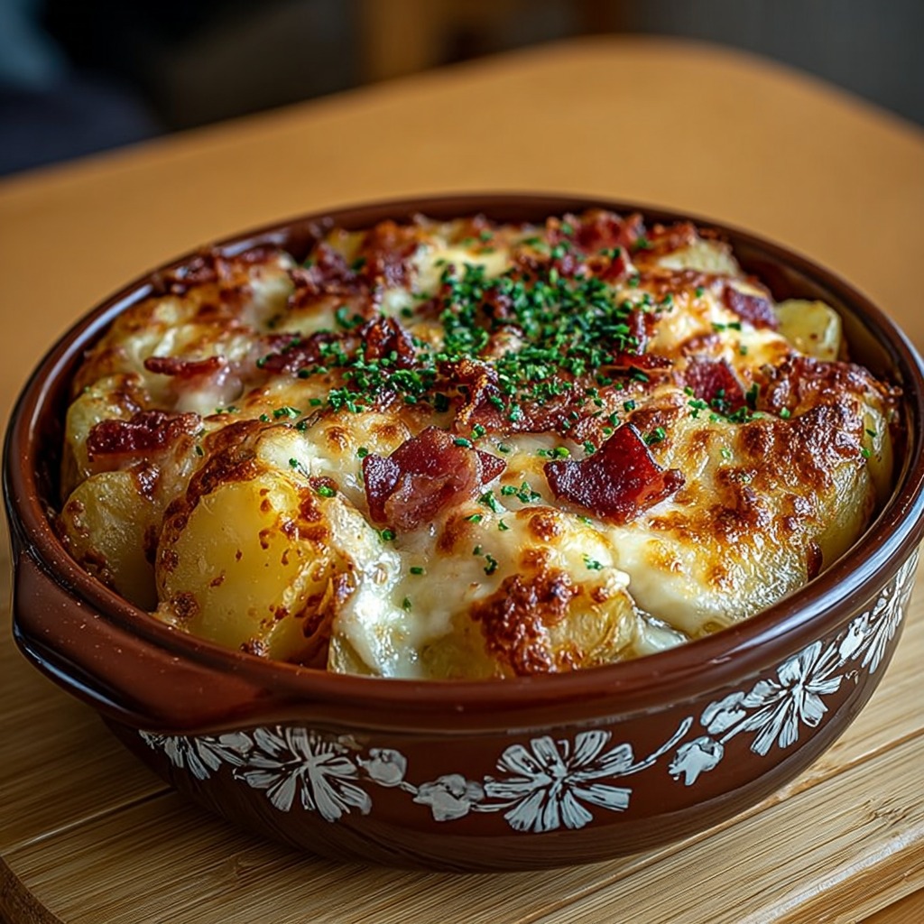 La cuisson se fait à température modérée afin de permettre aux pommes de terre de cuire lentement et de devenir fondantes. Le fromage fond progressivement et se mélange à la crème pour former une sauce onctueuse. Une cuisson trop rapide empêcherait les pommes de terre de cuire correctement et nuirait à l’harmonie du plat.
