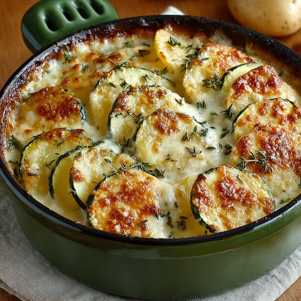 Le gratin dauphinois aux courgettes et herbes de Provence est une variation originale et parfumée du gratin dauphinois classique, qui allie la douceur et la texture fondante des pommes de terre à la fraîcheur des courgettes et aux arômes typiques de la Provence. Cette recette s’inscrit dans la tradition française de valorisation des légumes de saison, tout en apportant une touche méditerranéenne grâce aux herbes et aux parfums ensoleillés. L’ajout des courgettes rend le gratin plus léger et légèrement sucré, tandis que les herbes de Provence lui donnent une dimension aromatique complexe et raffinée.