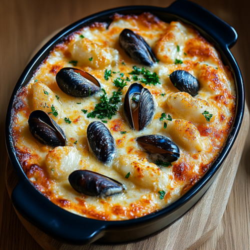 Le Gratin de Cabillaud, Crevettes et Moules est un plat raffiné qui marie la tendreté du cabillaud, la douceur des crevettes et la richesse des moules, le tout nappé d’une sauce crémeuse et gratiné au four. Idéal pour des occasions spéciales ou un dîner élégant, ce gratin est à la fois savoureux et impressionnant. Ce plat est parfait pour émerveiller vos invités avec une combinaison parfaite de fruits de mer et de saveurs crémeuses.