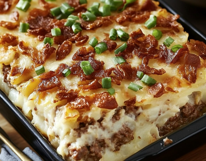 Le gratin de pain de viande aux pommes de terre et fromage est une revisite savoureuse du classique pain de viande. Ce plat rassemble des saveurs riches et réconfortantes grâce à une base de viande juteuse, une couche de purée de pommes de terre onctueuse et une garniture généreuse de fromage fondant et de bacon croustillant. Facile à préparer, il convient parfaitement aux repas en famille ou entre amis.