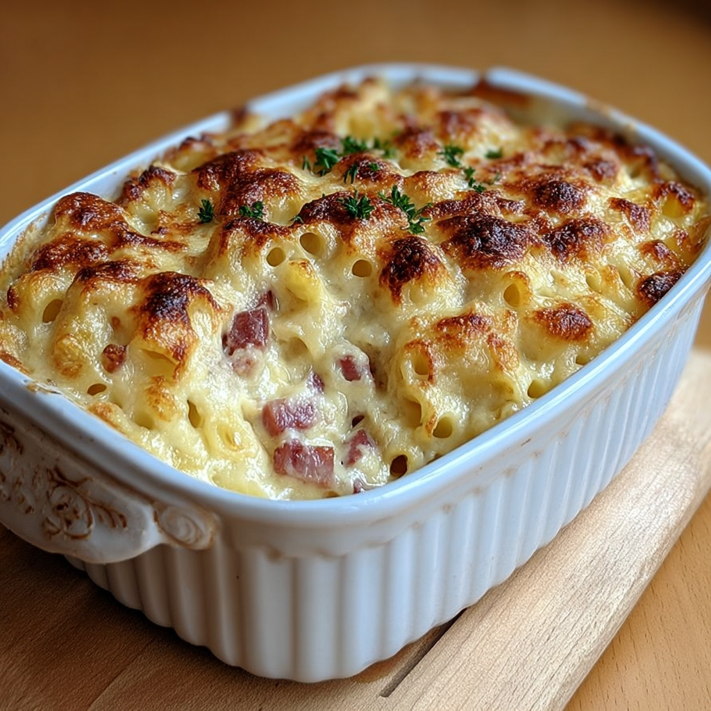 Un plat réconfortant et gourmand, parfait pour un repas familial. Les pâtes al dente se mêlent à une sauce crémeuse parfumée à l’ail et à la noix de muscade, agrémentée de lardons dorés et gratinée au fromage.