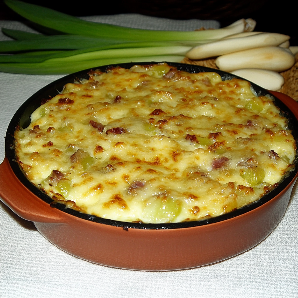 Un gratin crémeux de poireaux, lardons fumés et Roquefort, idéal pour un dîner absolument gourmand.
