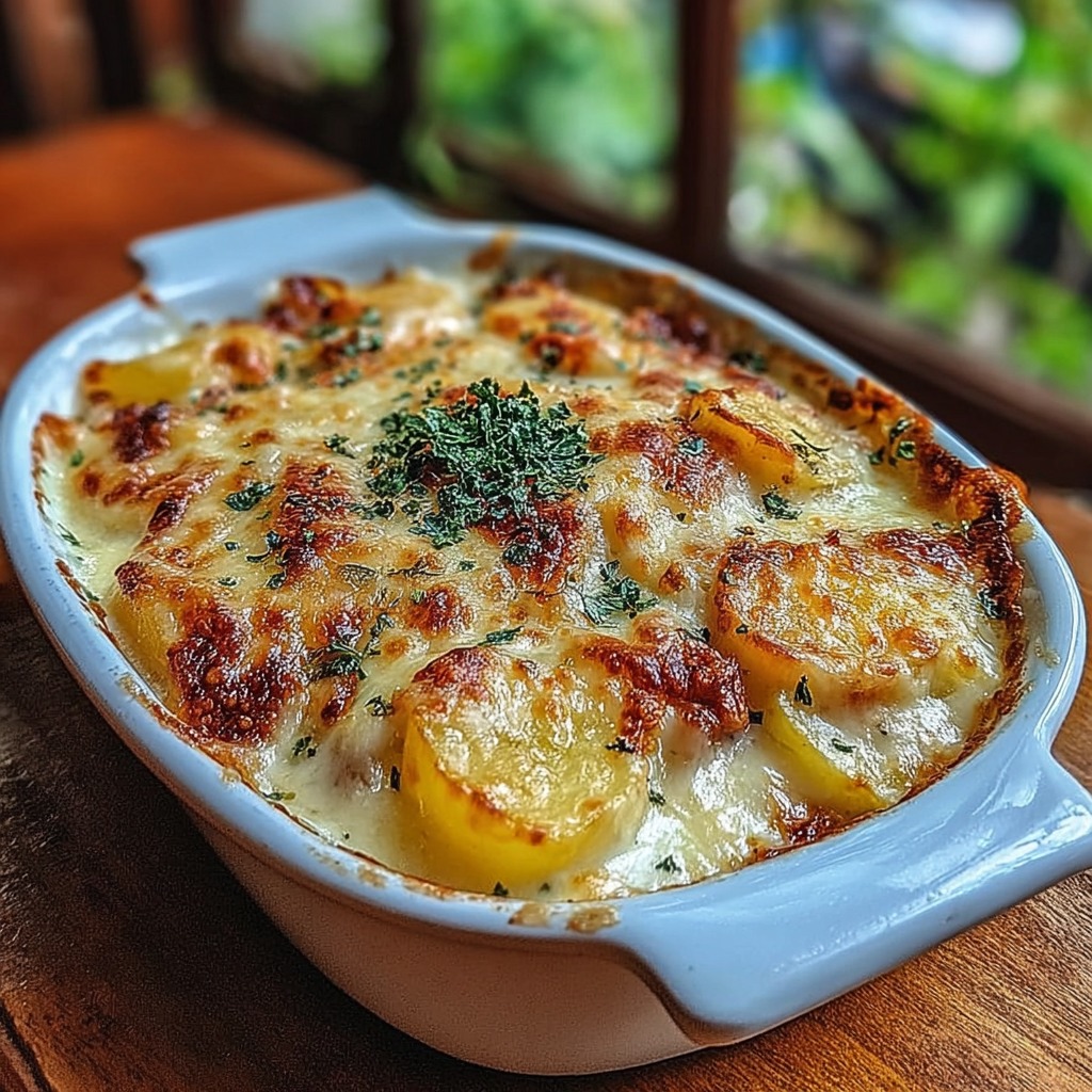 À table, servez le gratin bien chaud, découpé en parts généreuses. Son parfum de crème et de fromage se diffuse immédiatement, éveillant l’appétit. Chaque bouchée mêle la douceur de la pomme de terre, la richesse de la crème et la puissance du fromage fondu. C’est un plat qui réunit autour de la table et évoque la cuisine traditionnelle et authentique. Qu’il soit servi en accompagnement d’un rôti ou comme plat principal, il apporte toujours chaleur et satisfaction.