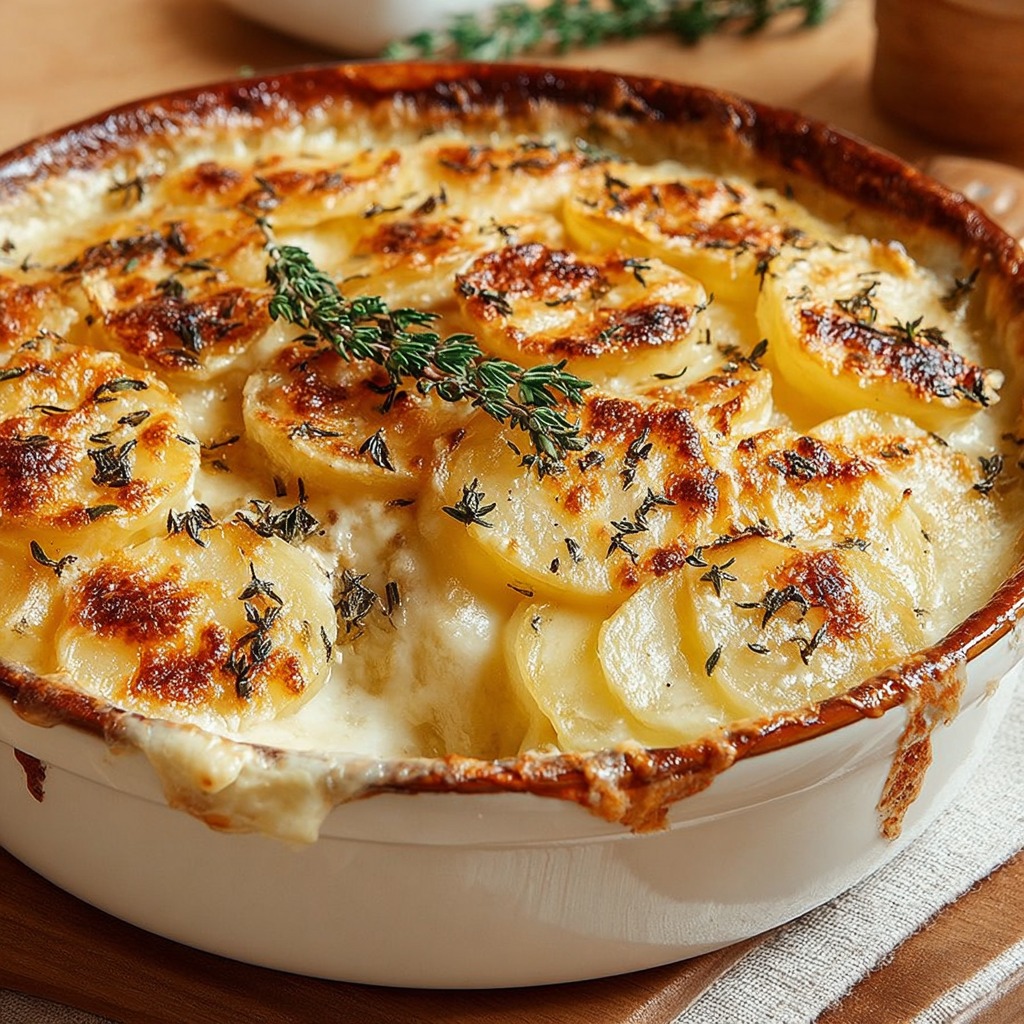 Un kilo de pommes de terre, un camembert entier d’environ deux cents grammes, deux cents millilitres de crème fraîche épaisse, cent millilitres de lait entier, deux gousses d’ail hachées, deux cuillères à soupe de beurre, sel et poivre noir moulu, une pincée de noix de muscade râpée, quelques brins de thym pour parfumer (facultatif).